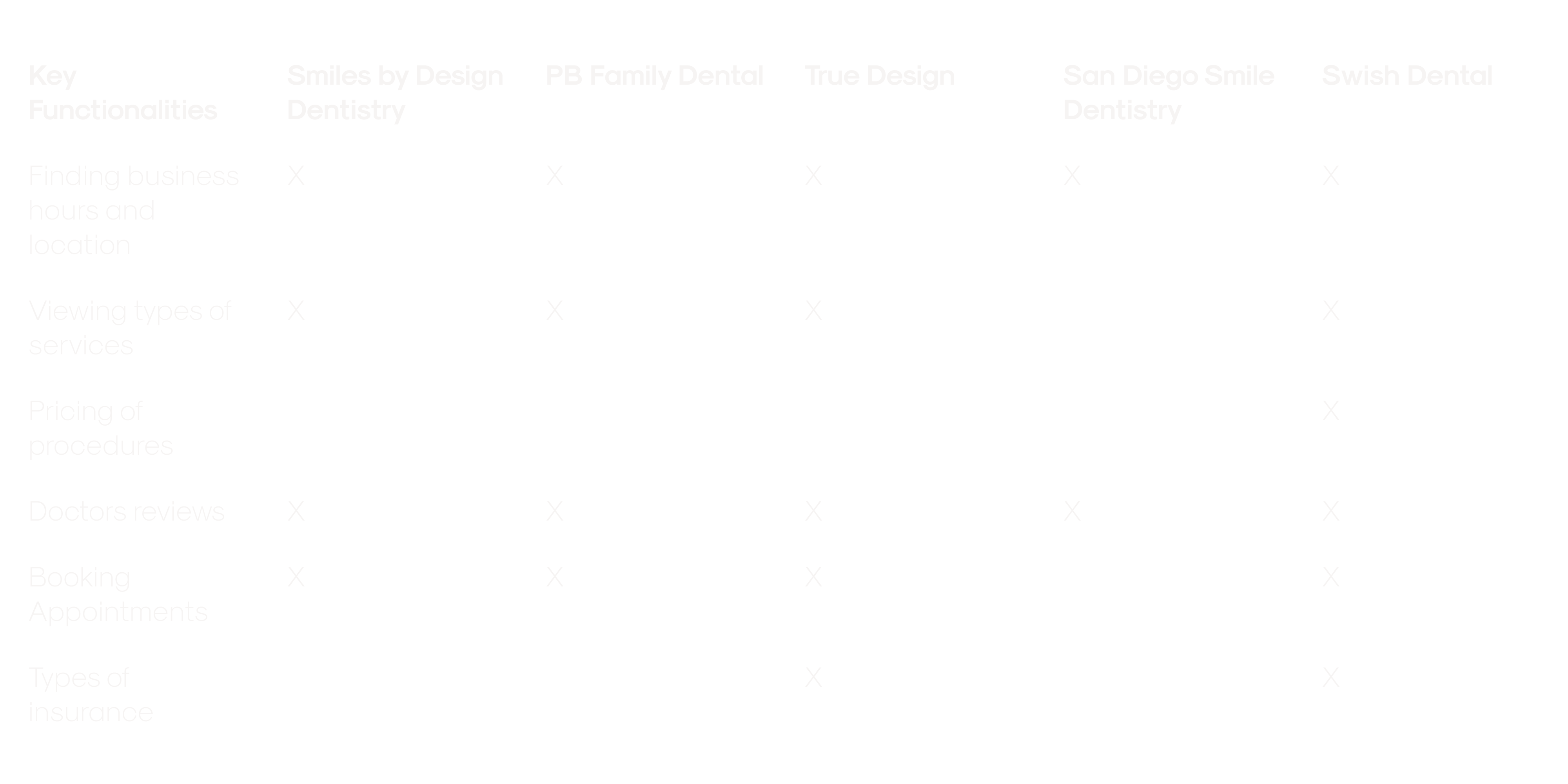 Wireframed the common components, presented to the client. Business hours: yes. Service listings: yes. Pricing: no. Dental regulations don't allow procedure costs on websites. Learned that design rules change depending on the industry.