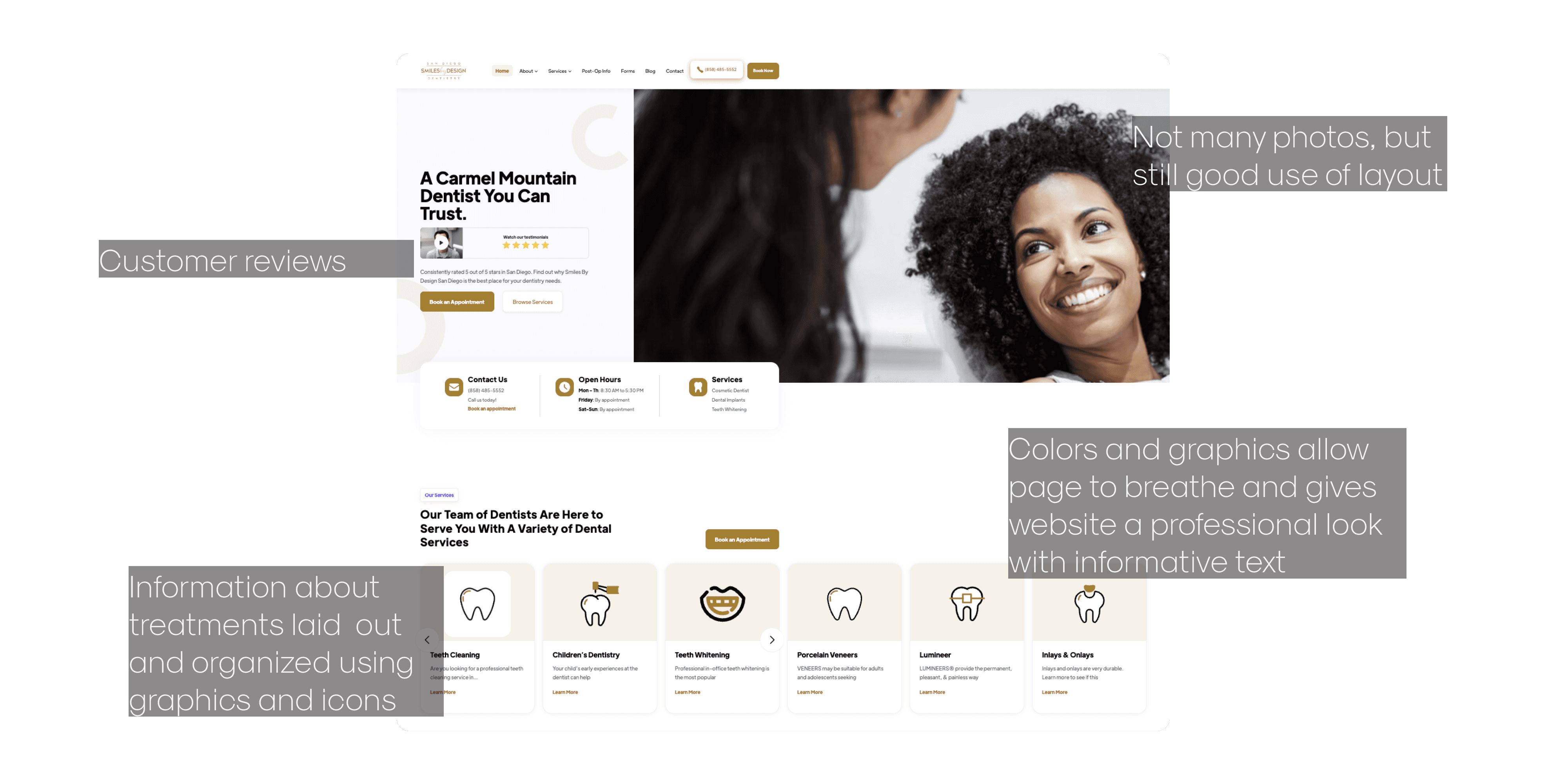 User testing with ages 22-60 revealed flaws in layout and functionality. Fixed them. More importantly, learned that dental sites need to feel caring, not sterile. People book appointments when they feel safe.