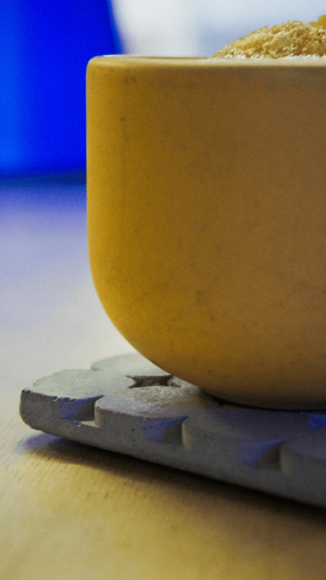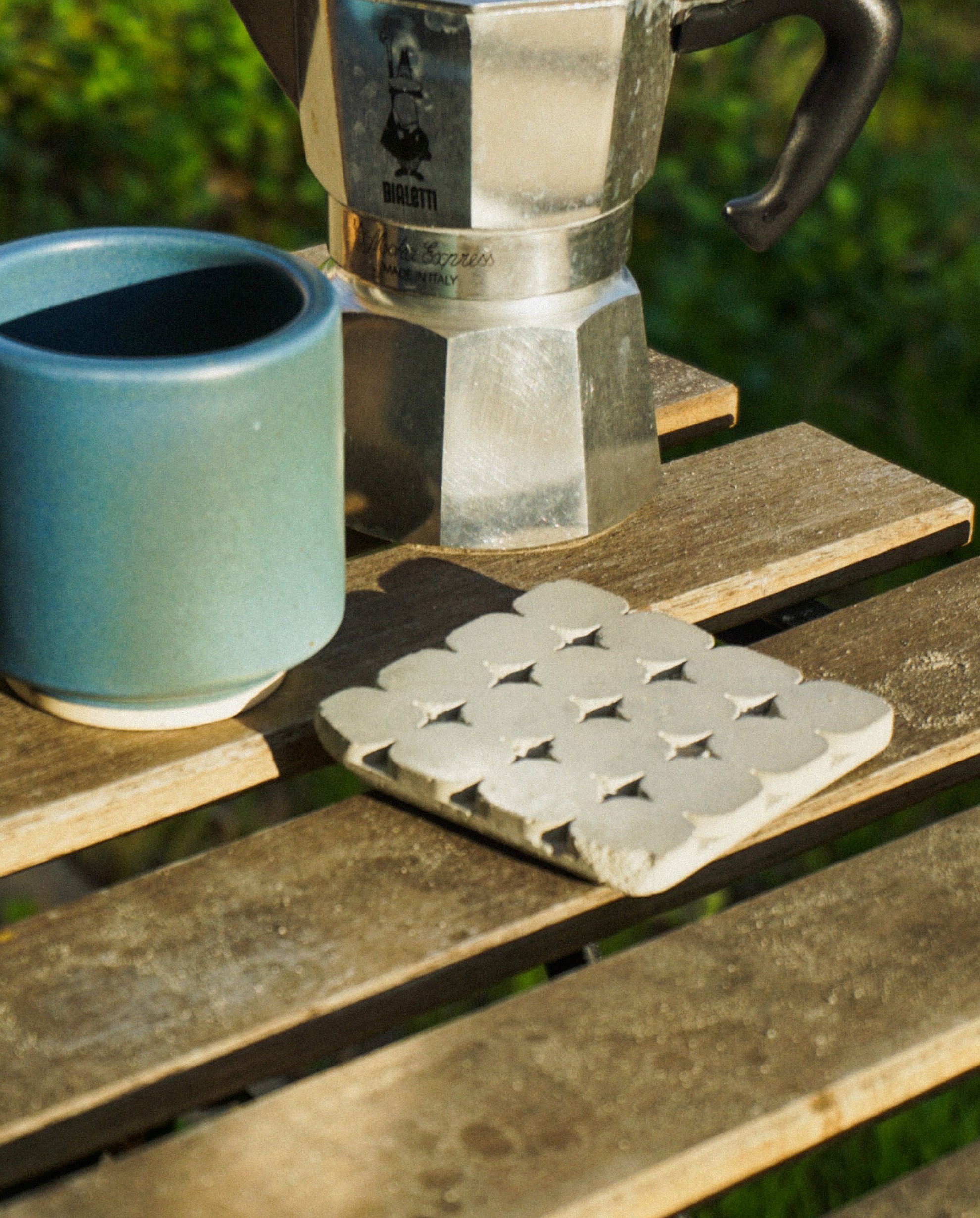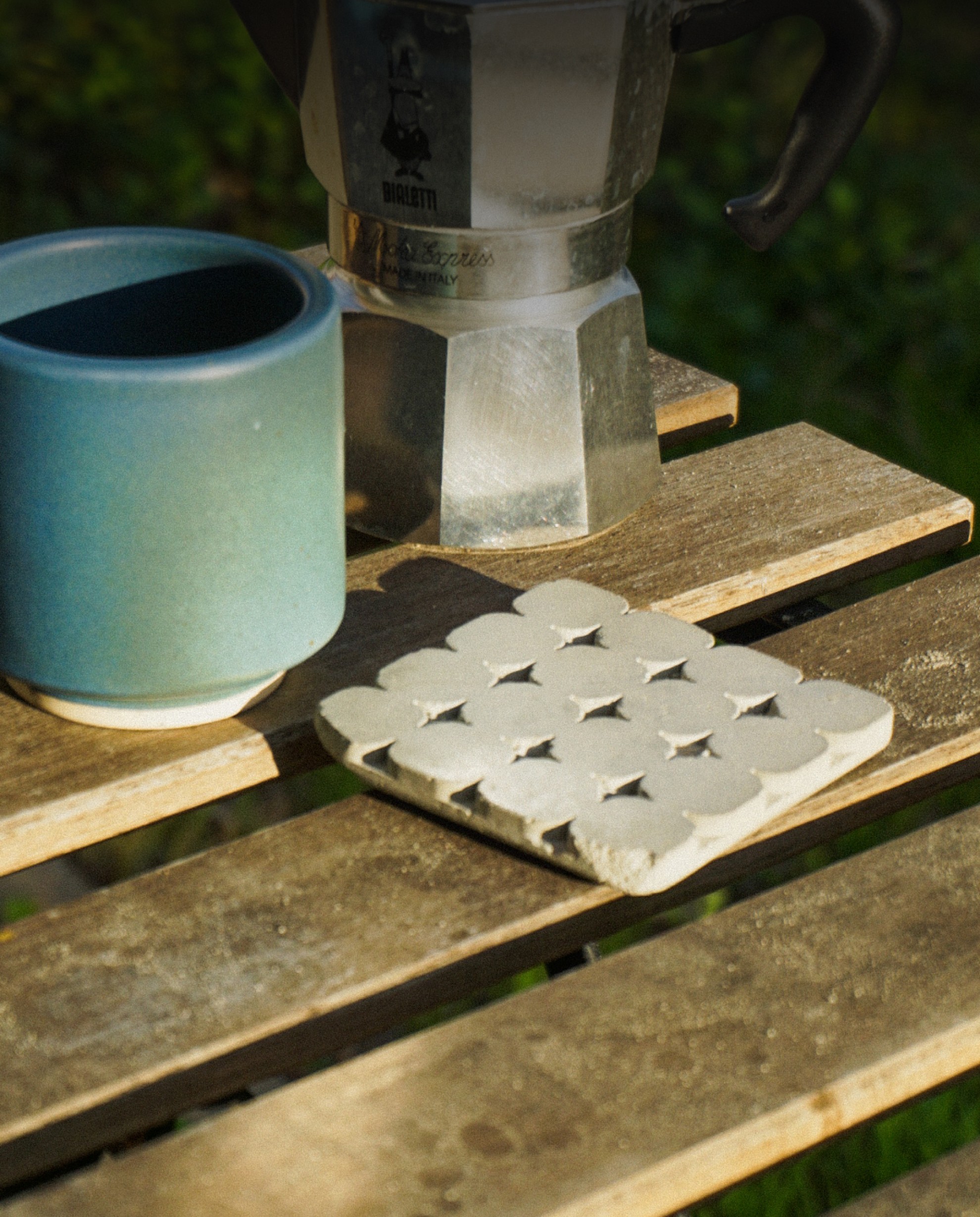 The Sternenuntersetzer was inspired by the Bauhaus poster "Black Stars". I made the coaster from concrete as a nod to Brutalism, which was influenced by the Bauhaus, and fitted it with 3D printed rebar—plastic being another key material the Bauhaus championed.